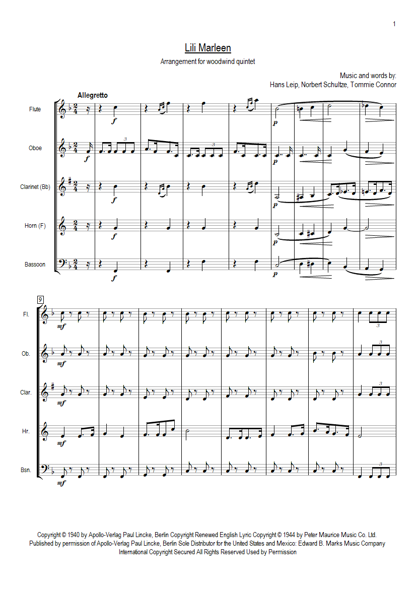 Lili Marleen Partitur